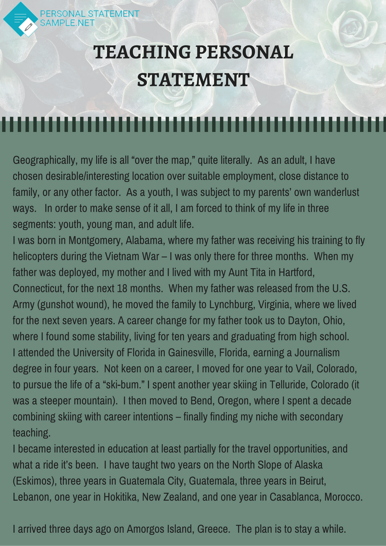 We've divided them into two categories: Cv personal statement examples to help you get started take a look at the following cv personal profile examples. To start this guide, i have included 10 examples of good personal statements, to give you an idea of how a personal statement should look, and what should be included. A personal profile, also known as a cv summary, is the opening statement of your cv. When pursuing teaching positions, your cv is usually the first impression headmasters, principals or hr professionals get of you.